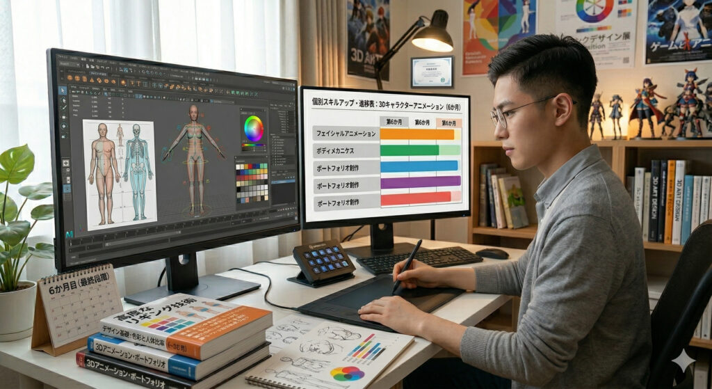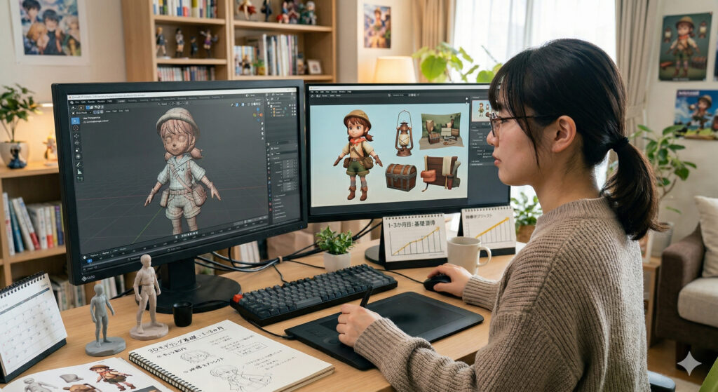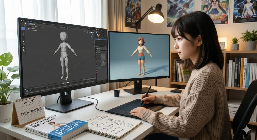 3〜6か月で、低ポリゴンでも美しく自然なアバター制作の基礎と、形状を簡略化するモデリング技術を学びます。