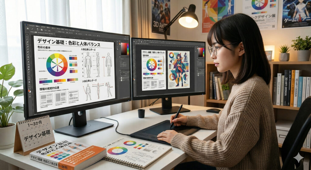 1~3か月で色彩や人体バランスなどのデザインの基礎を学び、情報を視覚的に伝えるスキルを習得します。